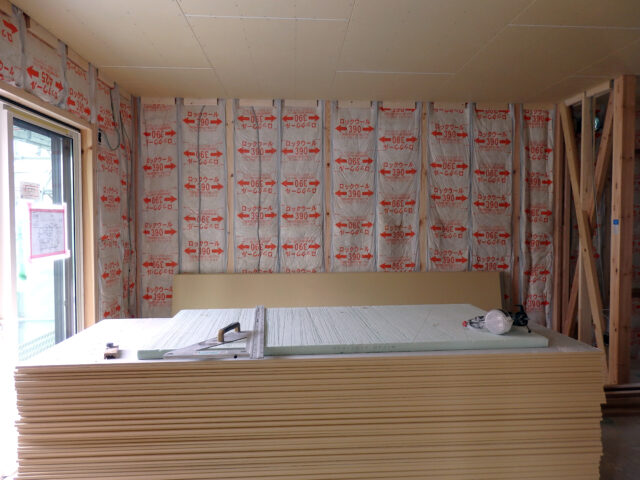 壁には断熱材(ロックウール)がしっかりと充填され、下地の木材が整った状態です。